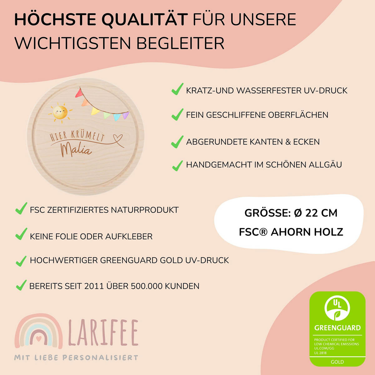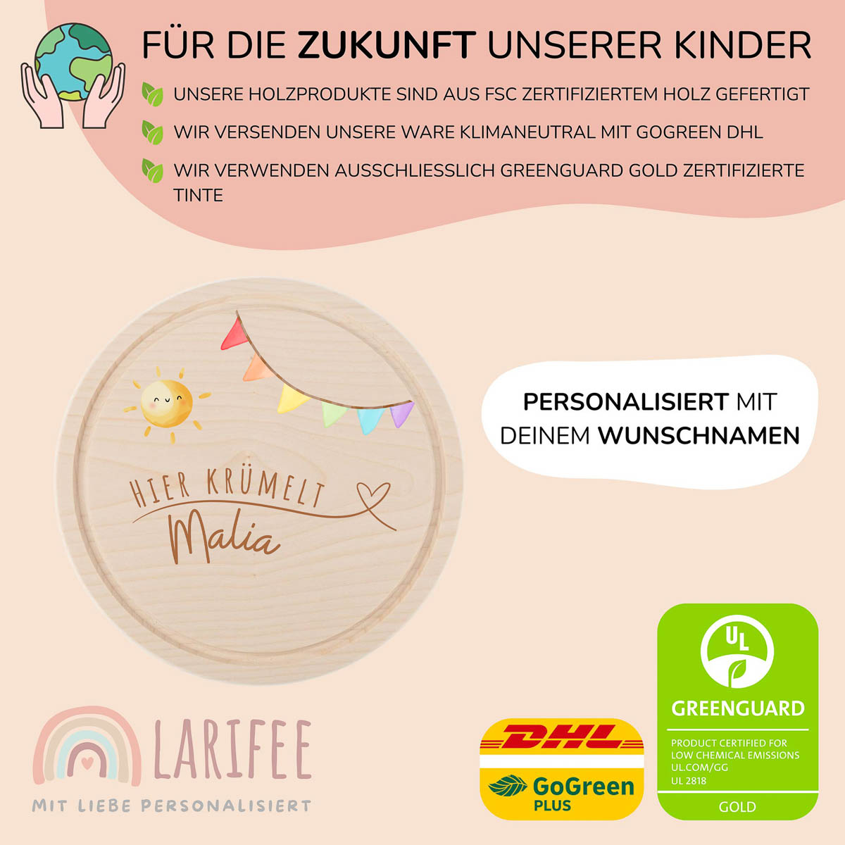 Für die Personalisierung nutzen wir keine Folie oder Aufkleber. Das Motiv wird mit einem speziellen UV-Druckverfahren direkt auf das Holz aufgebracht. Wir verwenden dabei umweltfreundliche, GREENGUARD Gold zertifizierte Tinte, die für Kinderspielzeug geeignet ist. Der Druck ist kratzfest und wasserfest, sodass das Motiv lange erhalten bleibt.