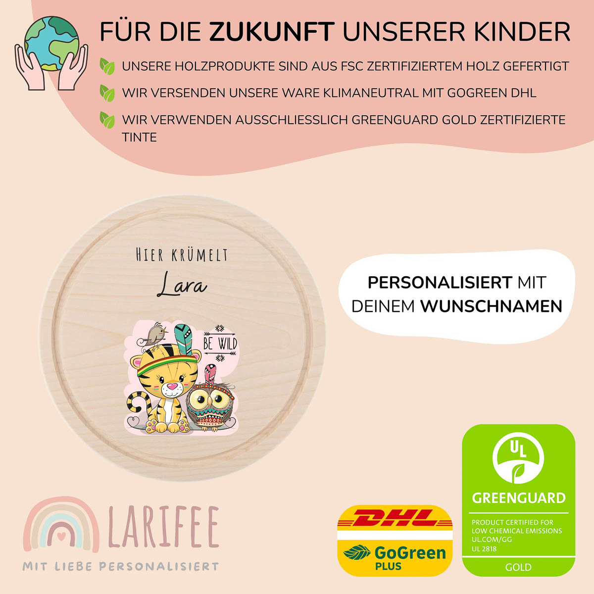 Frühstücksbrettchen Holz rund personalisiert – Tiger & Eule