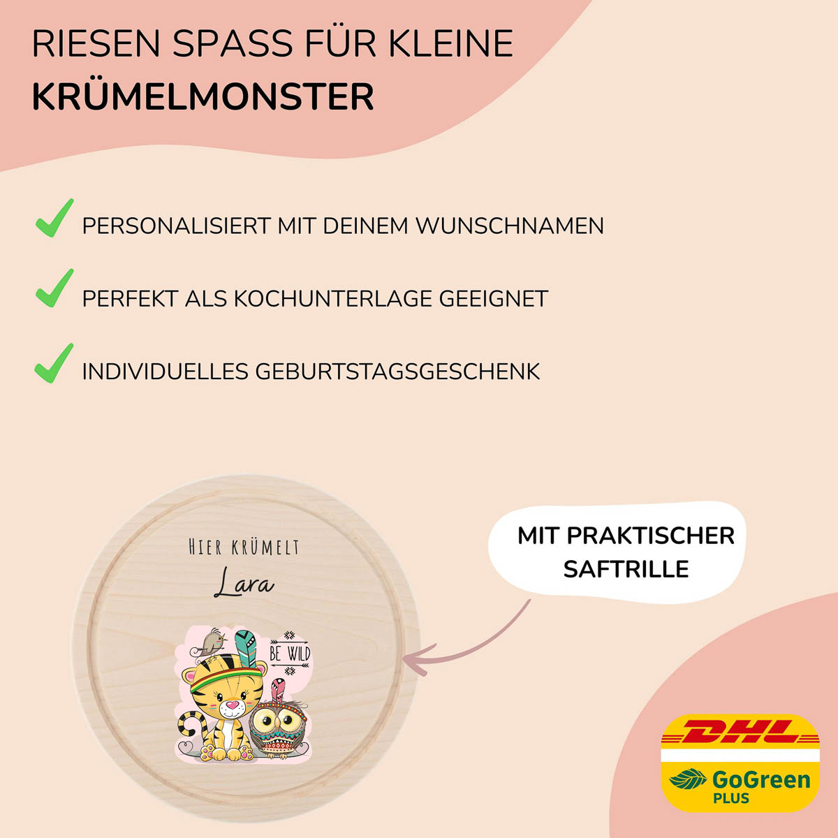 Tiger und Eule bringen gemeinsam Freude auf das runde, personalisierte Frühstücksbrettchen. Aus hochwertigem Ahornholz gefertigt und mit umweltfreundlicher Tinte bedruckt. Kratzfest und wasserfest – ideal für den täglichen Einsatz.