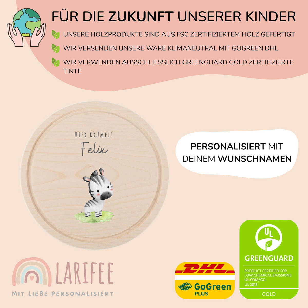 Für die Personalisierung nutzen wir keine Folie oder Aufkleber. Das Motiv wird mit einem speziellen UV-Druckverfahren direkt auf das Holz aufgebracht. Wir verwenden dabei umweltfreundliche, GREENGUARD Gold zertifizierte Tinte, die für Kinderspielzeug geeignet ist. Der Druck ist kratzfest und wasserfest, sodass das Motiv lange erhalten bleibt.