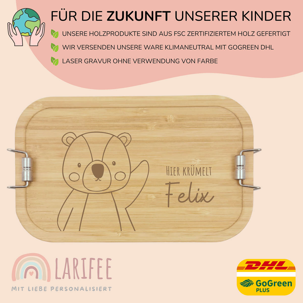 Die personalisierte Brotdose aus Weißblech mit süßem Bären-Motiv ist ein zuverlässiger Begleiter im Alltag. Sie verfügt über kinderfreundliche Verschlüsse, eine praktische Bambus-Trennwand und eine langlebige Gravur auf dem Deckel.