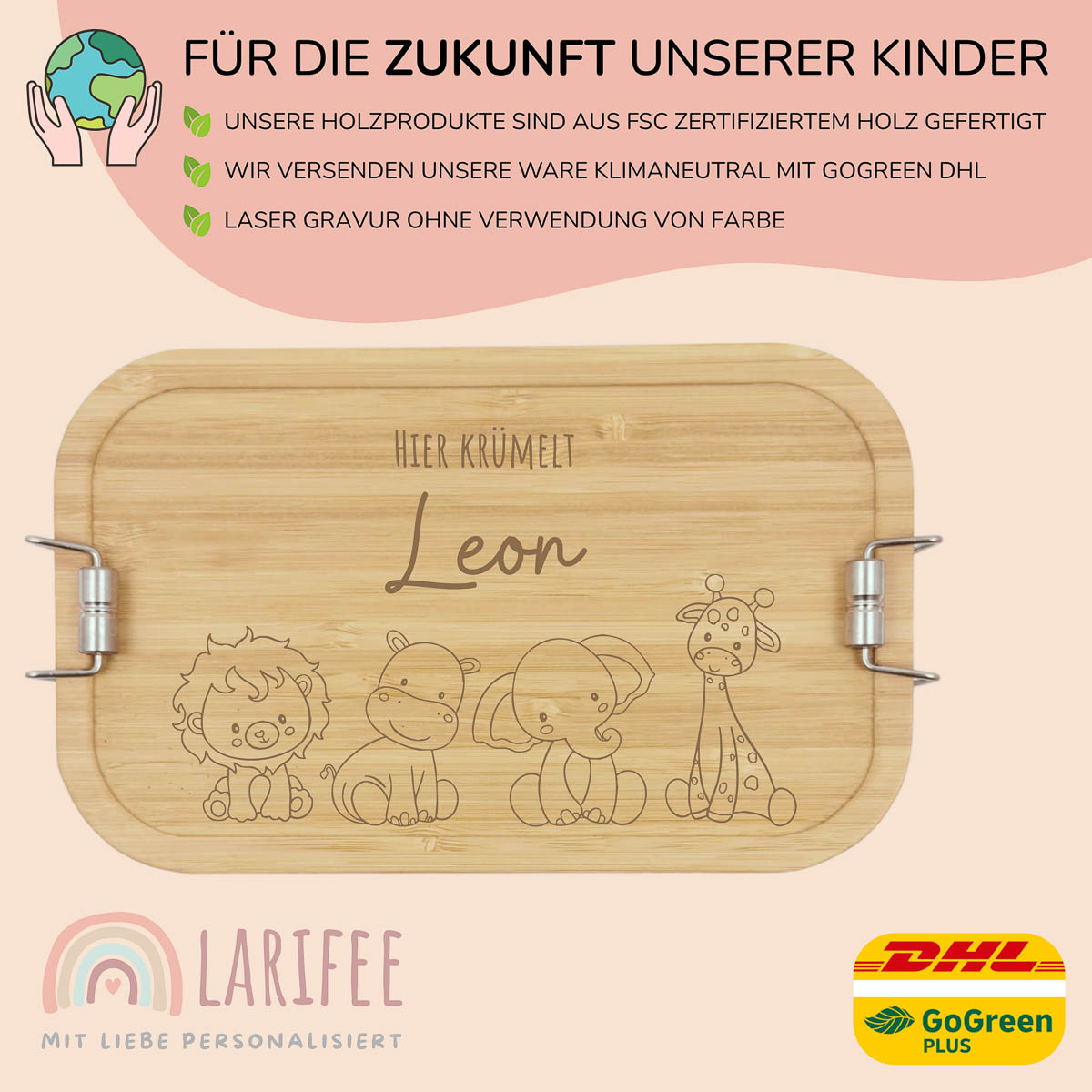 Die Brotdose mit fröhlichen Elefanten begeistert durch ihren personalisierten Bambusdeckel. Robustes Edelstahl, kindgerechte Verschlüsse und eine praktische Trennwand sorgen für Struktur beim Essen.