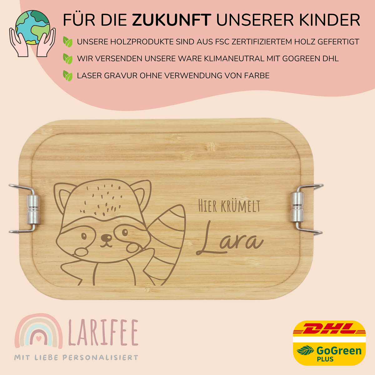 Die personalisierte Edelstahl-Brotdose mit freundlicher Giraffe wird durch die Personalisierung zum echten Lieblingsstück, mit langlebiger Gravur, flexibler Bambus-Trennwand und leicht bedienbaren Verschlüssen für Kinder.
