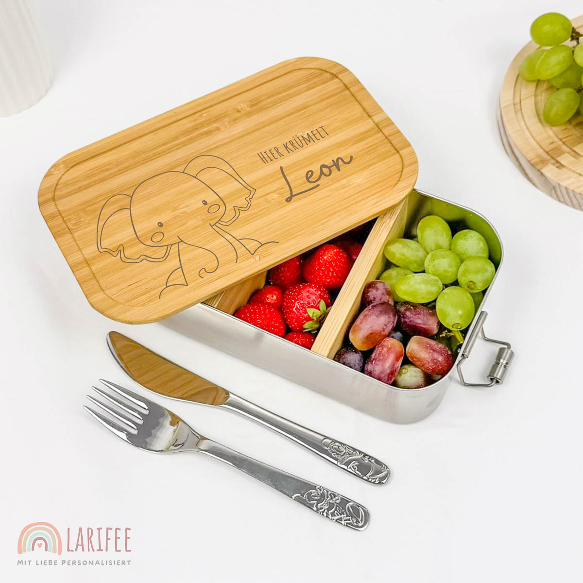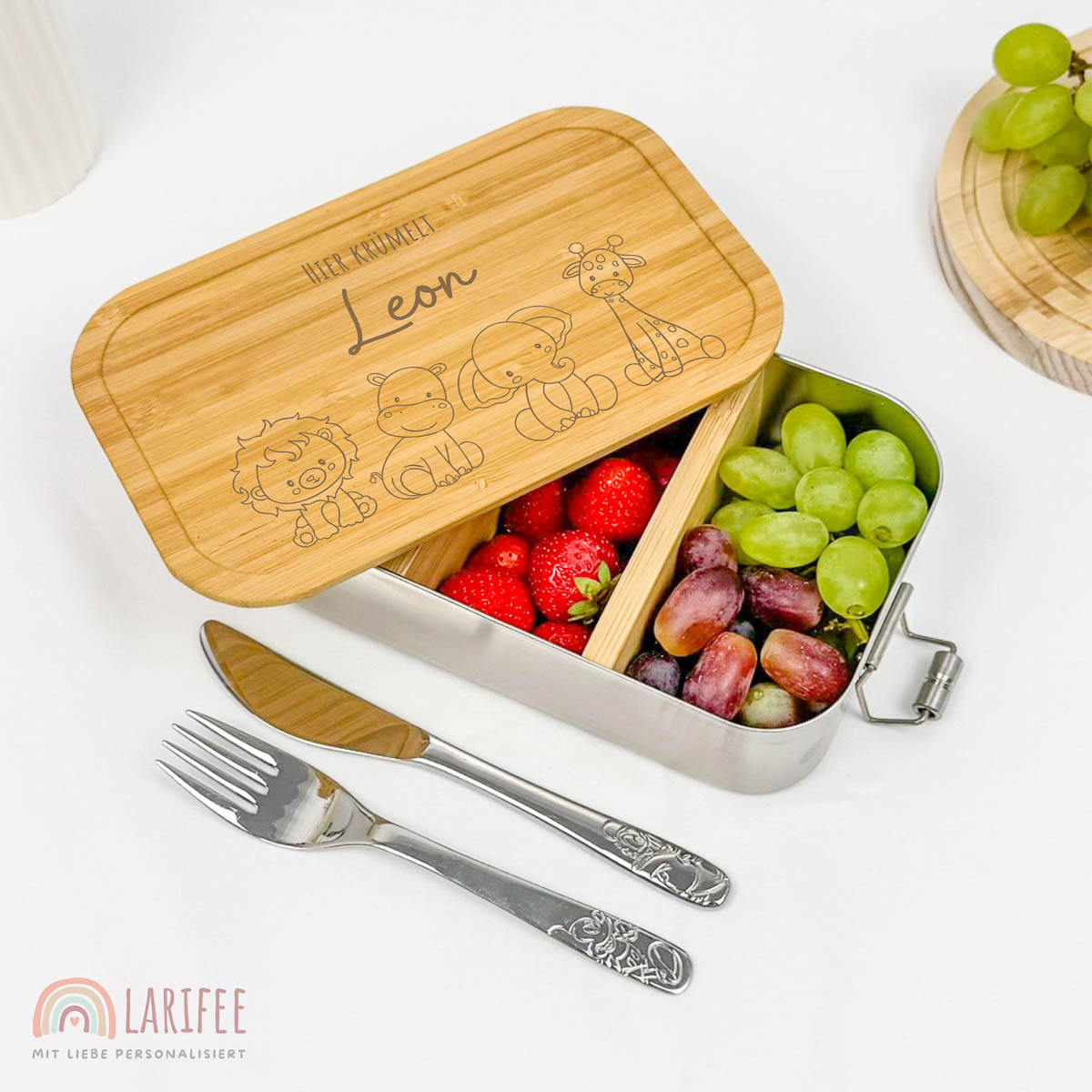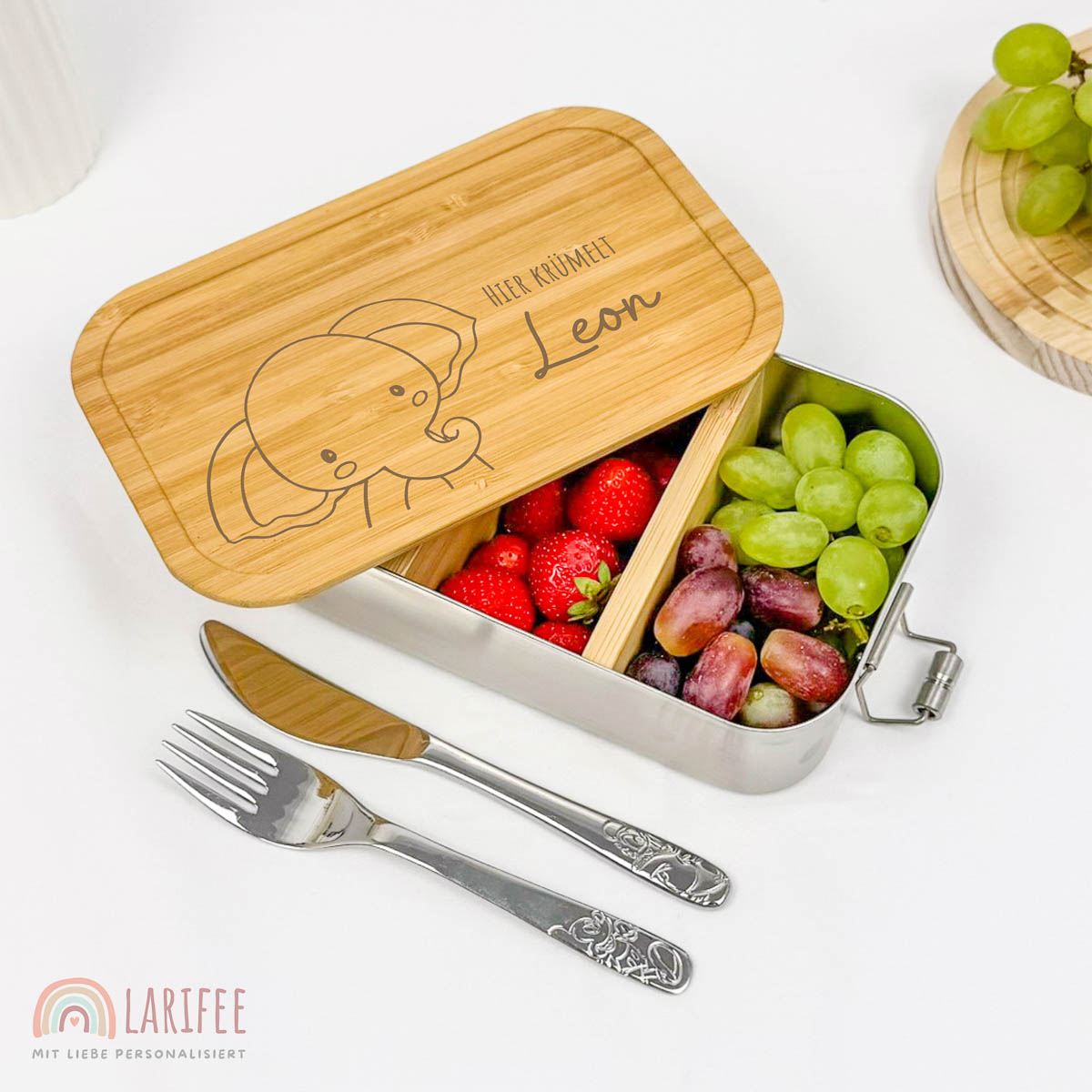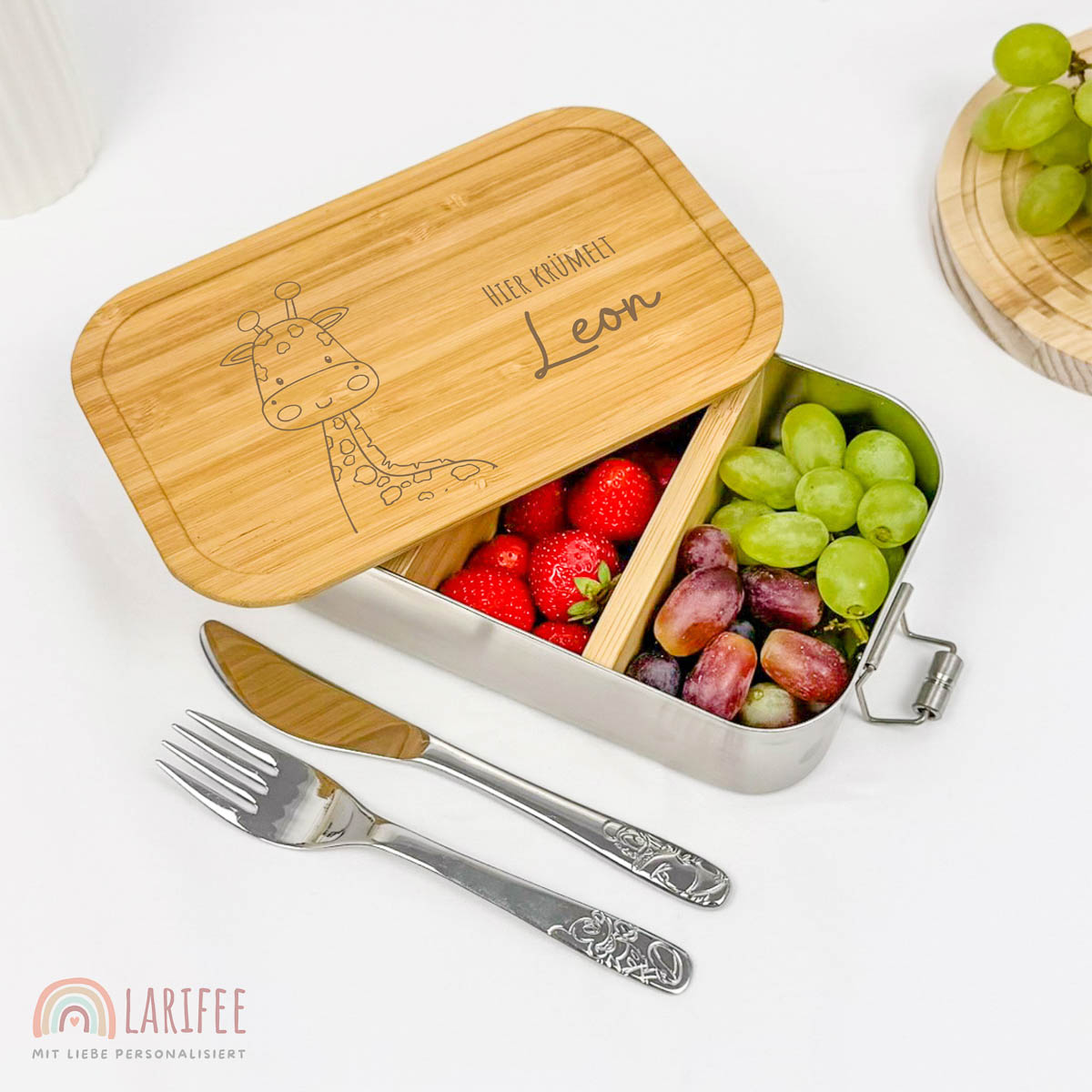 Eine liebevoll gestaltete, personalisierte Brotdose mit Hase bringt gute Laune in die Pause. Edelstahl, Bambus-Trennwand und sicherer Verschluss machen sie besonders praktisch. Perfekt für kleine Naturfreunde.