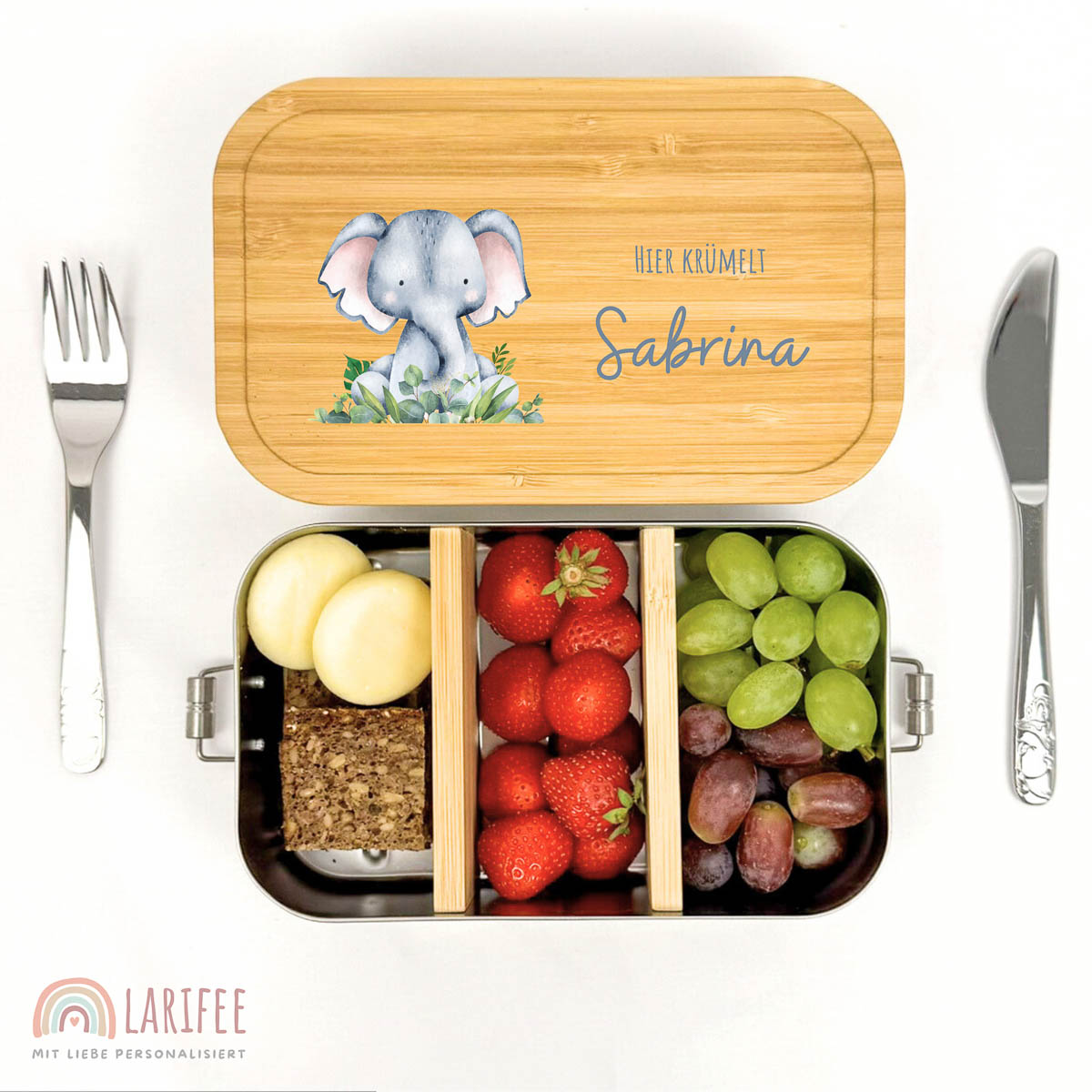 Diese personalisierte Brotdose mit niedlichem Elefanten bietet viel Platz für Snacks. Aus Edelstahl gefertigt, mit Bambus-Trennwand und leicht zu öffnendem Verschluss.