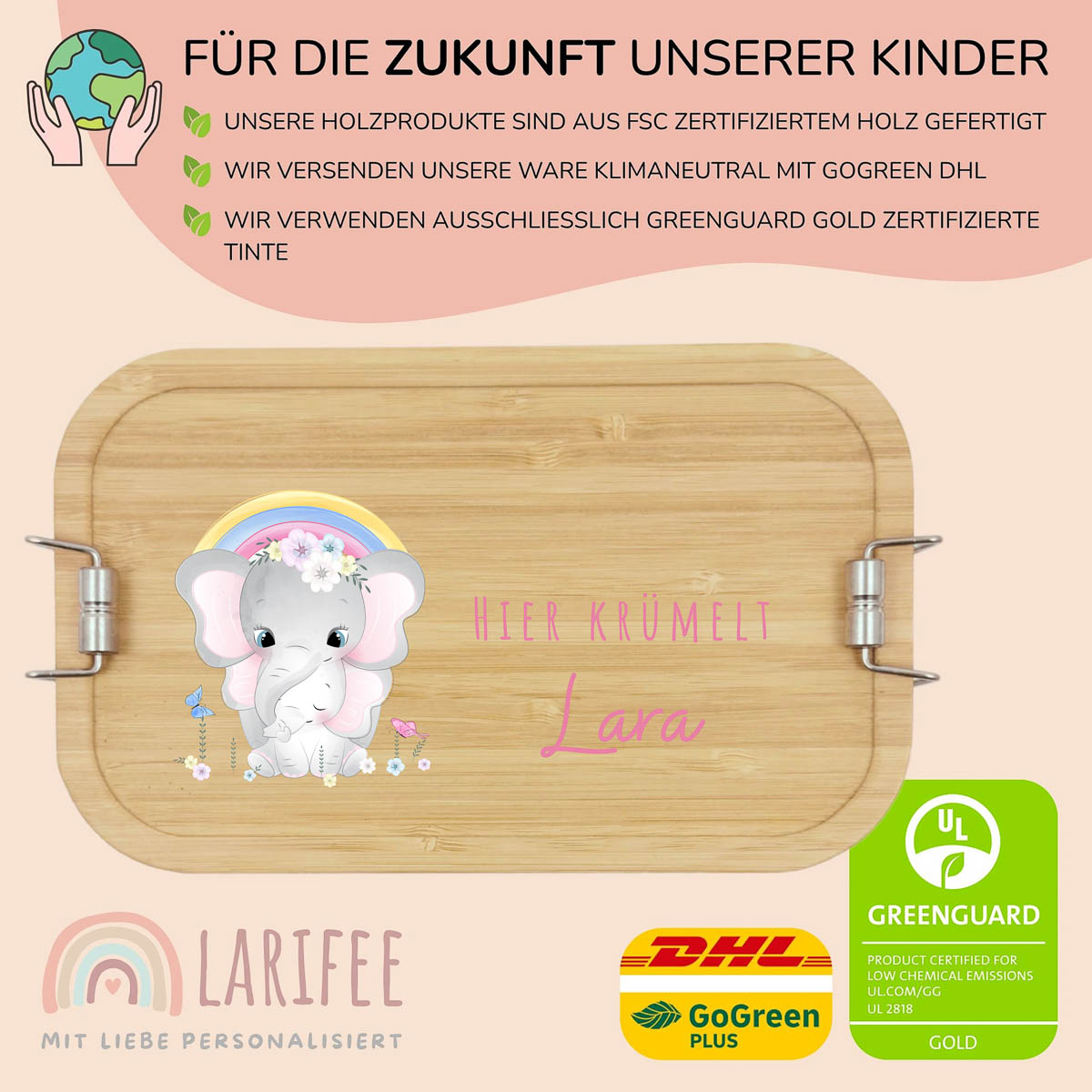 Die personalisierte Brotdose mit liebevollen Elefanten begeistert kleine Abenteurer. Edelstahlgehäuse, Bambus-Trennwand und kindgerechter Verschluss sorgen für Ordnung und Sicherheit. Ideal für unterwegs.