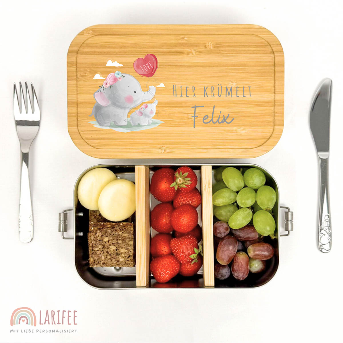 Die personalisierte Brotdose mit Elefantenmama und Kind schenkt Geborgenheit für unterwegs. Mit Edelstahlgehäuse, Bambus-Trennwand und kindgerechtem Verschluss wird sie zum liebevollen Begleiter. Ideal für kleine Herzensmenschen.