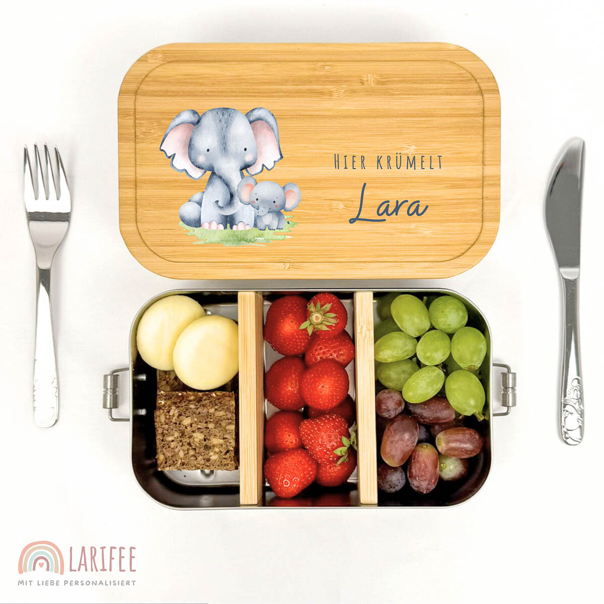 Die Brotdose mit fröhlichen Elefanten begeistert durch ihren personalisierten Bambusdeckel. Robustes Edelstahl, kindgerechte Verschlüsse und eine praktische Trennwand sorgen für Struktur beim Essen.