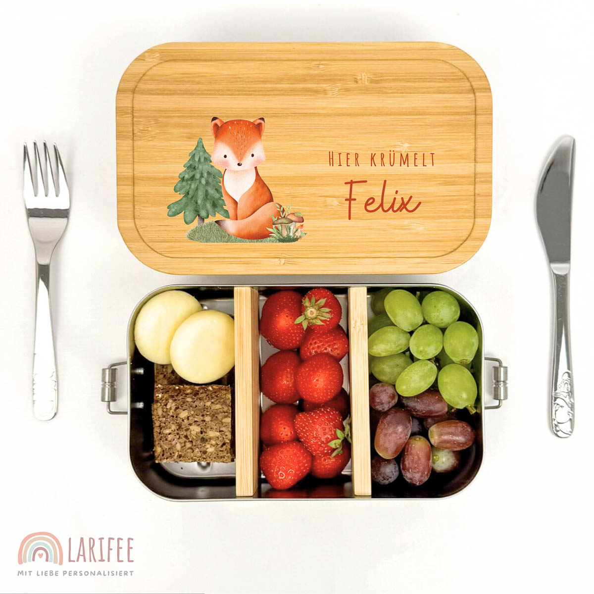 Die Brotdose mit neugierigem Fuchs ist personalisiert und aus robustem Edelstahl gefertigt. Der kinderfreundliche Verschluss und die Trennwand aus Bambus machen sie besonders alltagstauglich.