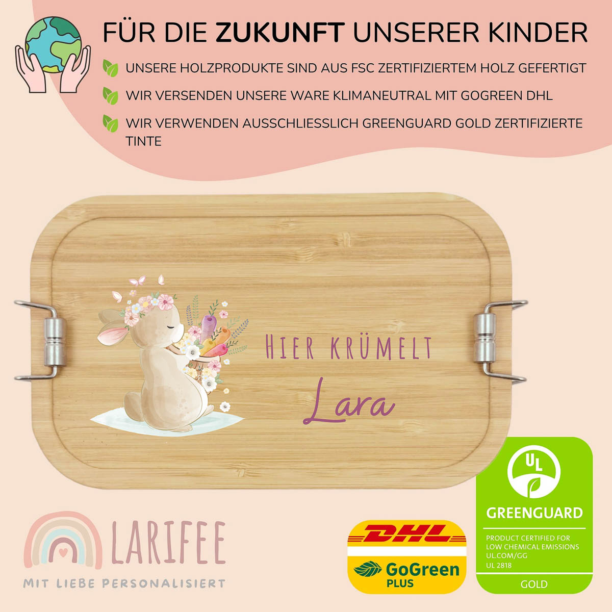 Eine liebevoll gestaltete, personalisierte Brotdose mit Hase bringt gute Laune in die Pause. Edelstahl, Bambus-Trennwand und sicherer Verschluss machen sie besonders praktisch. Perfekt für kleine Naturfreunde.