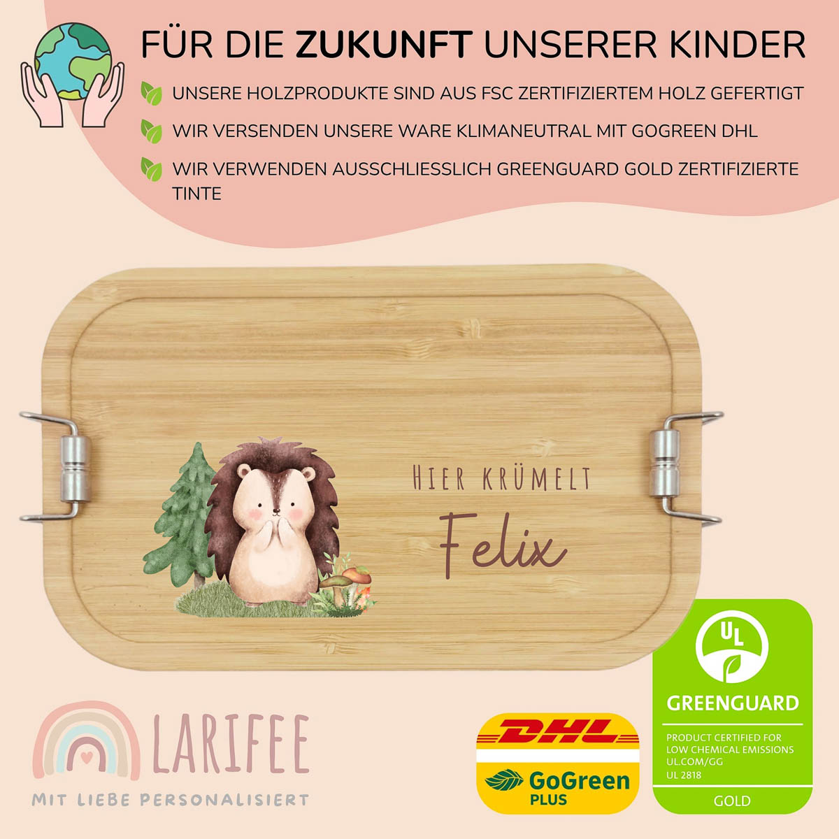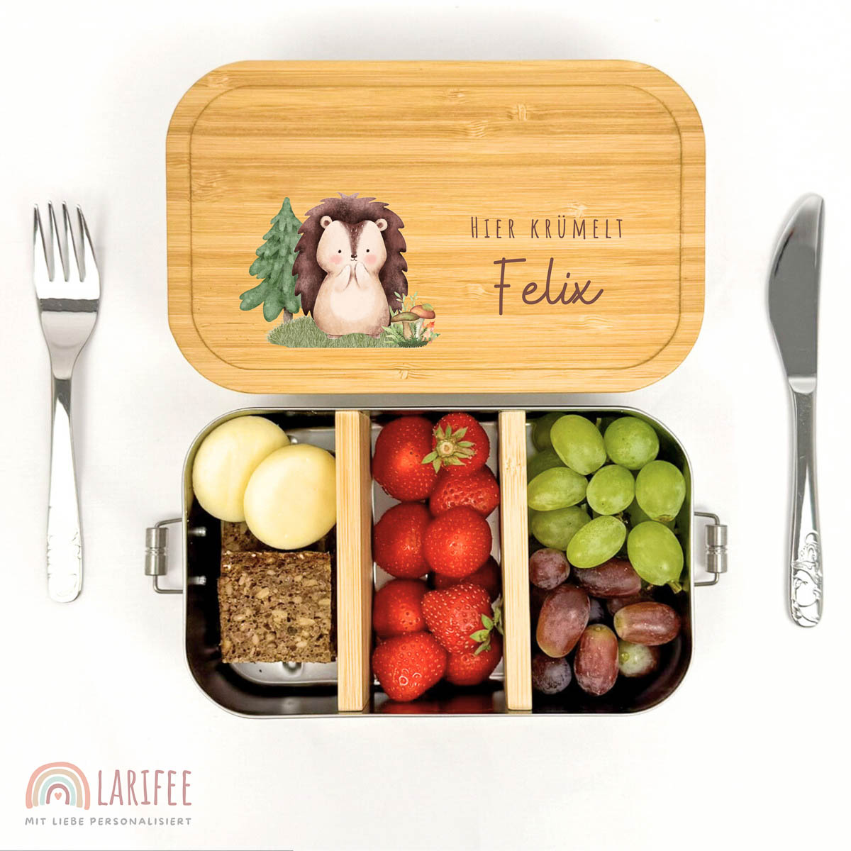 Die personalisierte Edelstahl-Brotdose mit kleinem Igel sorgt für Freude in jeder Pause. Mit Bambus-Trennwand für Ordnung und einem Verschluss, der auch für Kinder leicht zu handhaben ist.
