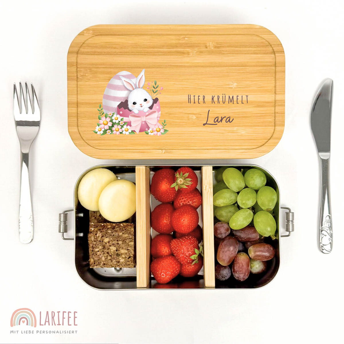 Die personalisierte Edelstahl-Brotdose mit dem kleinen Osterhasen bringt frühlingshafte Stimmung in jede Pause.