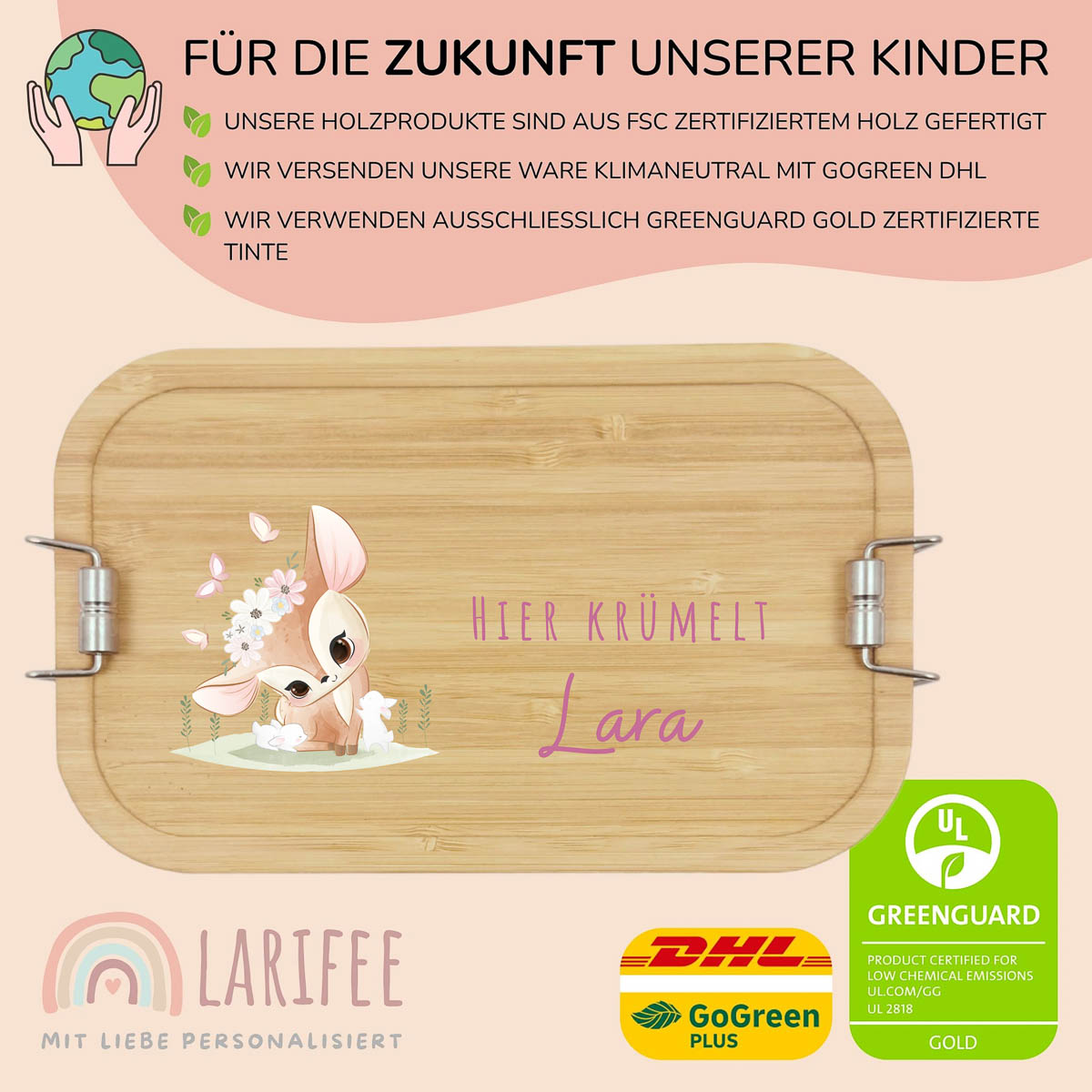 Eine personalisierte Brotdose mit süßem Reh macht jede Mahlzeit zu etwas Besonderem. Aus hochwertigem Edelstahl gefertigt, mit Bambus-Trennwand und kinderfreundlichem Verschluss. Für kleine Abenteurer perfekt geeignet.