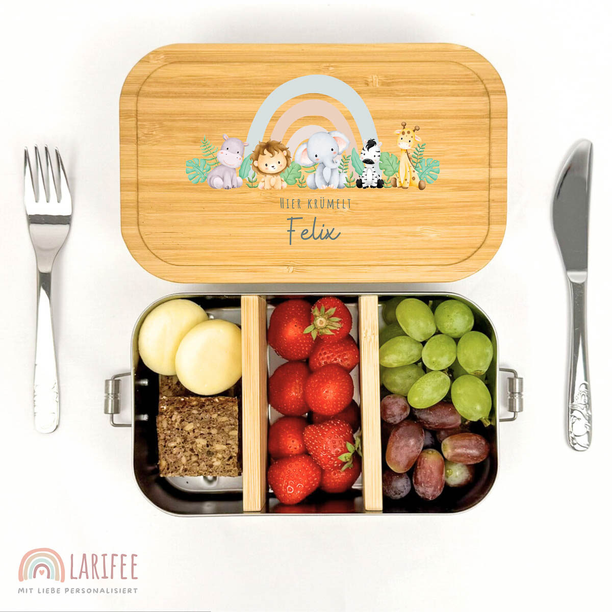 Ob Elefant, Giraffe oder Löwe – die personalisierte Brotdose mit Safari-Tieren lädt zum Entdecken ein.