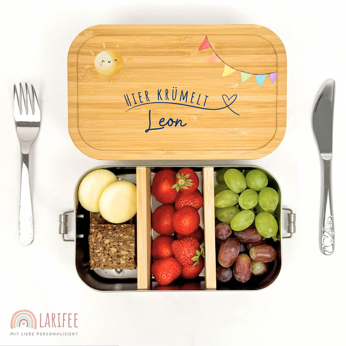 Mit strahlender Sonne und personalisiertem Deckel sorgt diese Edelstahl-Brotdose für gute Laune in jeder Pause.