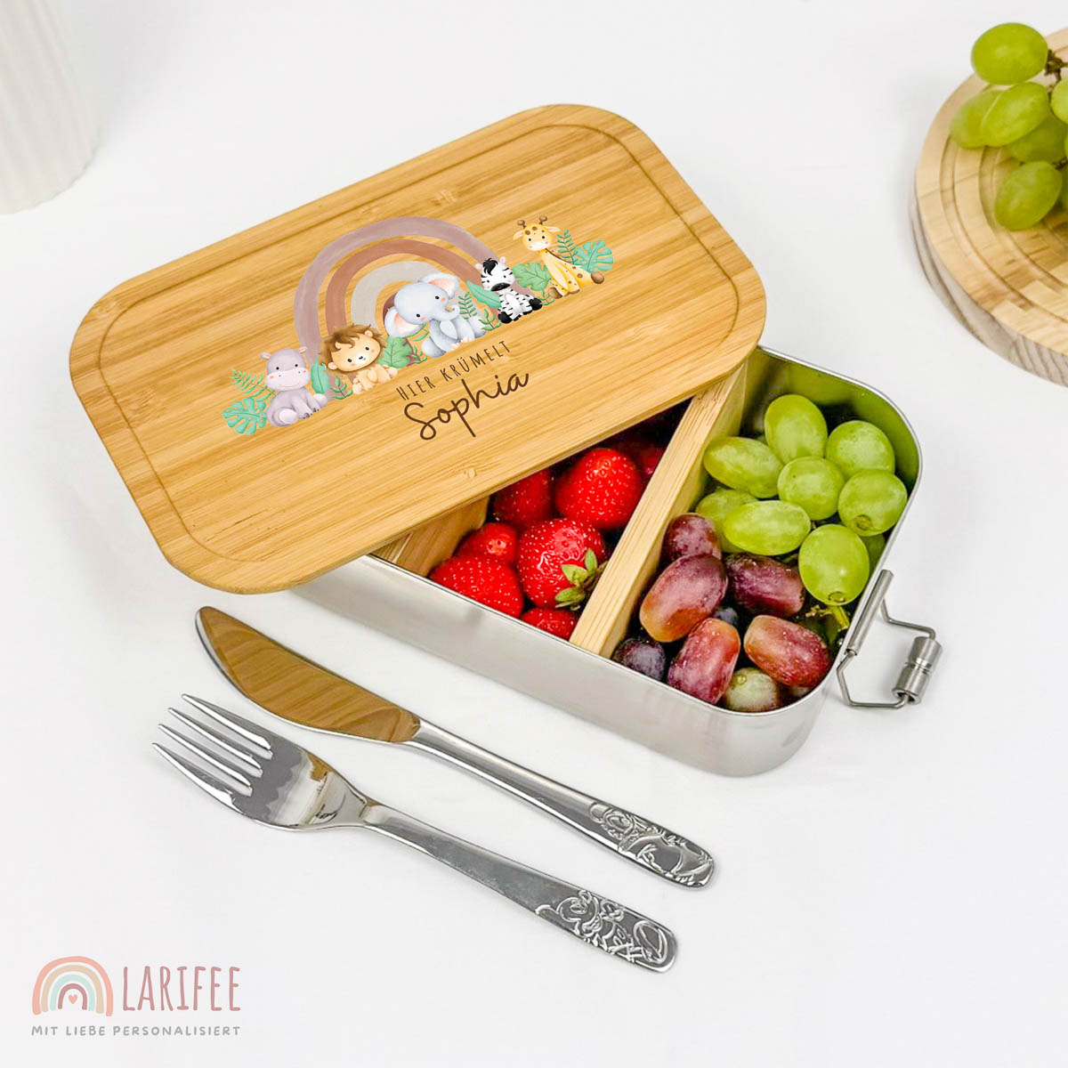 Die Brotdose besteht aus hochwertigem Edelstahl. Sie ist stabil, widerstandsfähig und für den täglichen Einsatz in Kita, Schule oder auf Ausflügen bestens geeignet.