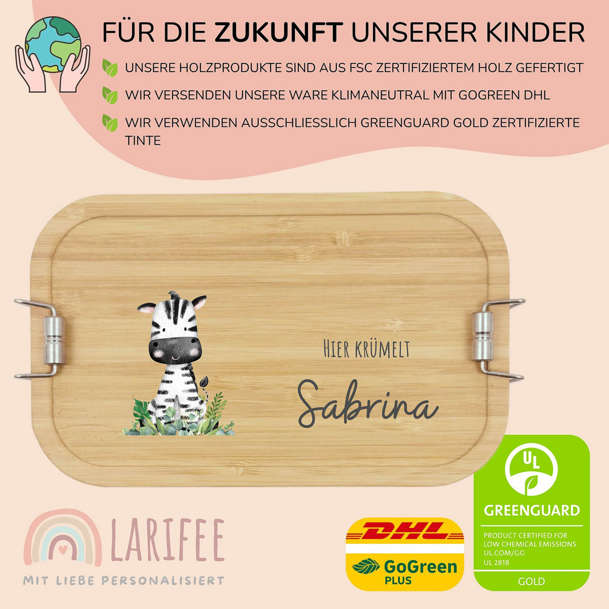 Das gestreifte Zebra auf dem personalisierten Bambusdeckel bringt Spaß in die Pause. Edelstahl, Trennwand und kinderleichte Verschlüsse sorgen für eine rundum praktische Brotdose.