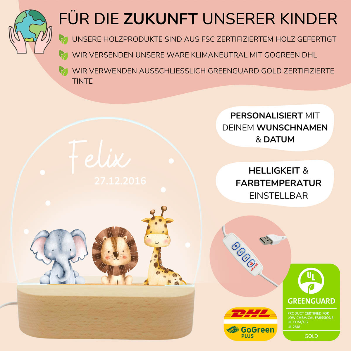 Ein Nachtlicht personalisiert ist ein ganz besonderes Geschenk – individuell, liebevoll und einzigartig. Durch den UV-Druck mit dem Namen und dem Geburtsdatum des Kindes entsteht ein persönliches Einzelstück, das emotional berührt und lange in Erinnerung bleibt. Zur Geburt schenkt es Wärme und Geborgenheit, zur Taufe wird es zu einem bleibenden Erinnerungsstück mit Bedeutung.