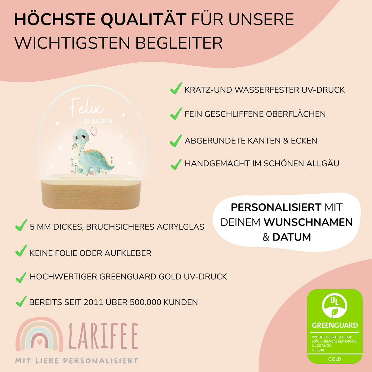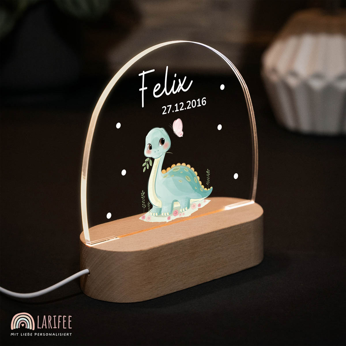 Ein kleiner Dino für große Träume – dieses Nachtlicht begeistert alle kleinen Dino-Fans. Es bringt Abenteuerstimmung ins Kinderzimmer und sorgt gleichzeitig für sanftes Licht in der Nacht. Individuell bedruckt mit Name und Geburtsdatum, gefertigt aus robustem Acrylglas mit abgerundeten Kanten und einem Sockel aus Buchenholz.