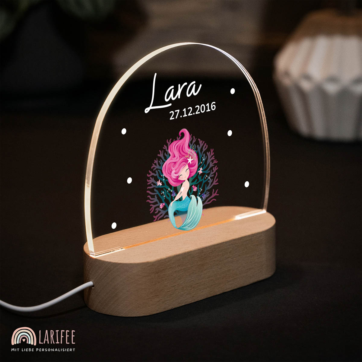 Die traumhafte Meerjungfrau lädt zum Abtauchen in magische Unterwasserwelten ein. Sie schenkt Leichtigkeit, Fantasie und ein sanftes Licht zum Einschlafen. Mit Name und Geburtsdatum personalisiert, gefertigt aus bruchsicherem Acrylglas mit abgerundeten Kanten und einem Sockel aus Buchenholz.