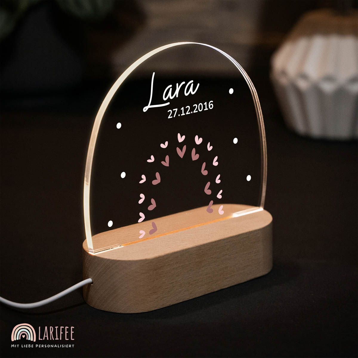 Liebevoll gestaltete Herzen machen dieses Nachtlicht zu einem emotionalen Blickfang. Ideal als Geschenk, um einem besonderen kleinen Menschen Geborgenheit zu schenken. Personalisiert mit Name und Geburtsdatum, gefertigt aus bruchsicherem Acrylglas mit abgerundeten Kanten und einem Sockel aus Buchenholz.