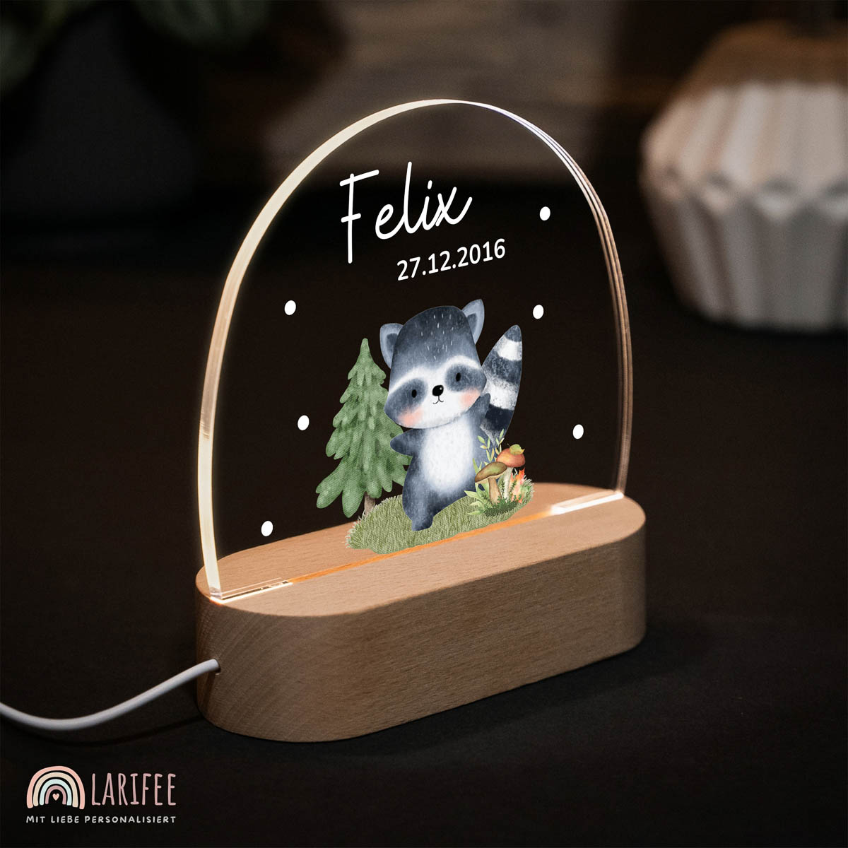 Der aufgeweckte Waschbär sorgt für charmante Abendstunden im Kinderzimmer. Bedruckt mit Name und Geburtsdatum. Bruchsicheres Acrylglas mit abgerundeten Kanten, kombiniert mit einem Sockel aus Buchenholz.