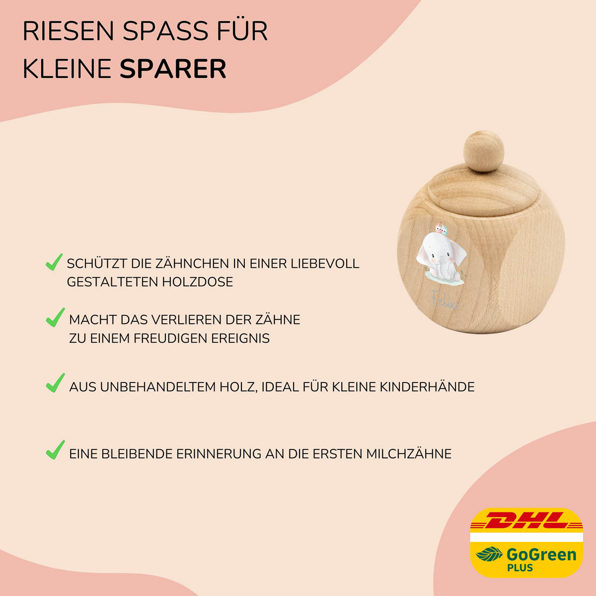 Zahndose Holz mit Name Personalisiert – Elefant mit Vögel
