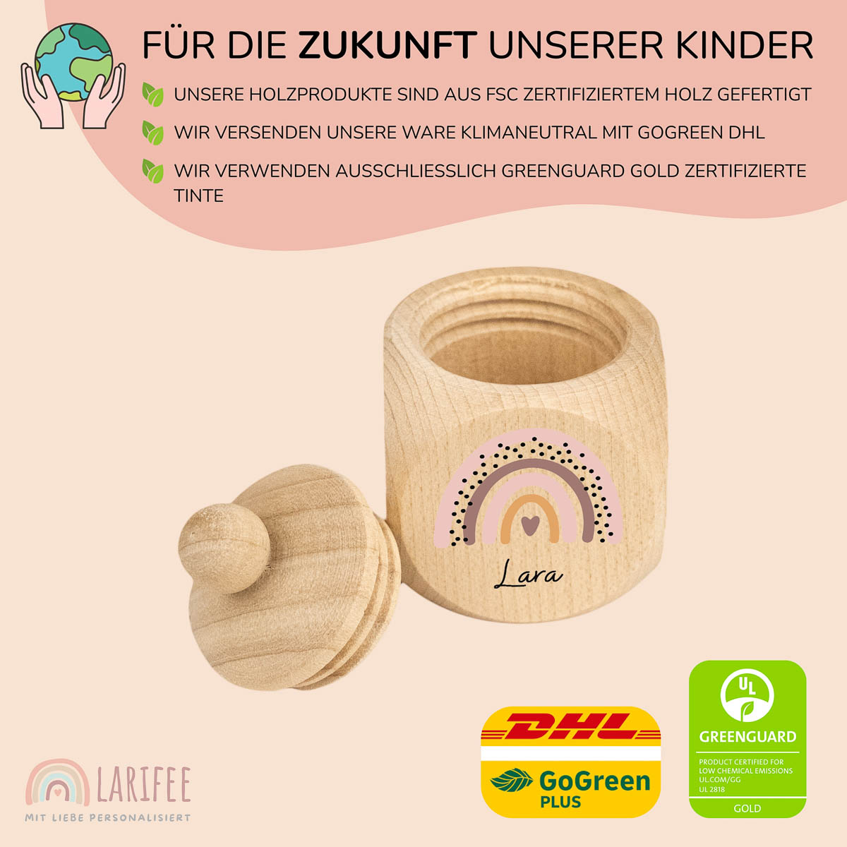 Bunt, fröhlich und voller Leben – der Regenbogen bringt Farbe in den Alltag. Diese personalisierte Zahndose aus Ahornholz ist ideal, um alle Milchzähne gesammelt und sicher aufzubewahren.